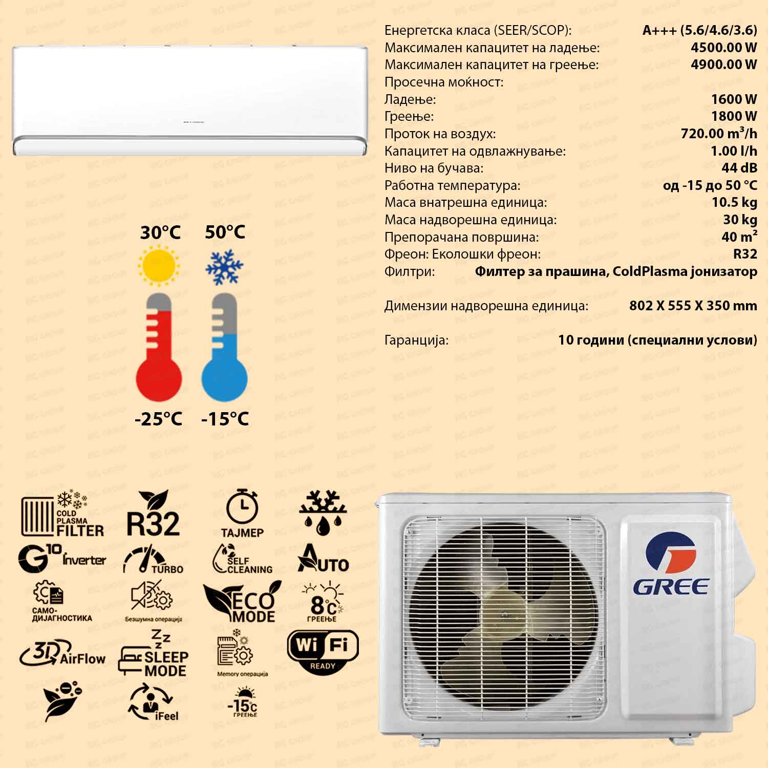 Функции:Самодијагностика, Грее-AI технологија на самоучење, Паметно Одвлажнување, (HDT)-Хибридна Дефрост Технологија, Лимитатор на Моќноста на 50%, 75%, или 100%, вградена UV-C ламба за дезинфекција на бактерии и вируси, Интелигентен Дефрост, I-Feel, Плазма филтер, вградена WiFi контрола, Греење од 8°С до 30°С греење, кономичен мод, Турбо функција за брзо ладење/греење, 7 Fan брзини на дување, Quiet Fan брзина, Aвтоматски вертикален и хоризонтален Swing.